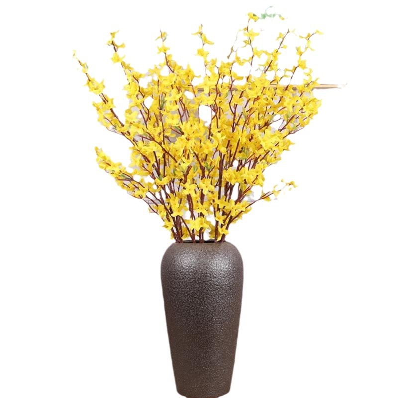 Cành hoa mai giả được sử dụng nhiều nhất để cắm bình trưng Tết trong phòng khách. Chỉ cần một bình gốm hoặc bình thủy tinh là bạn đã có ngay một điểm nhấn rực rỡ. Sắc vàng của hoa mai tượng trưng cho may mắn, mang đến không khí đoàn viên và tài lộc cho cả gia đình. Có thể kết hợp thêm bao lì xì, đồng xu vàng, dây lộc để tạo cảm giác ấm cúng và phú quý đầu năm.