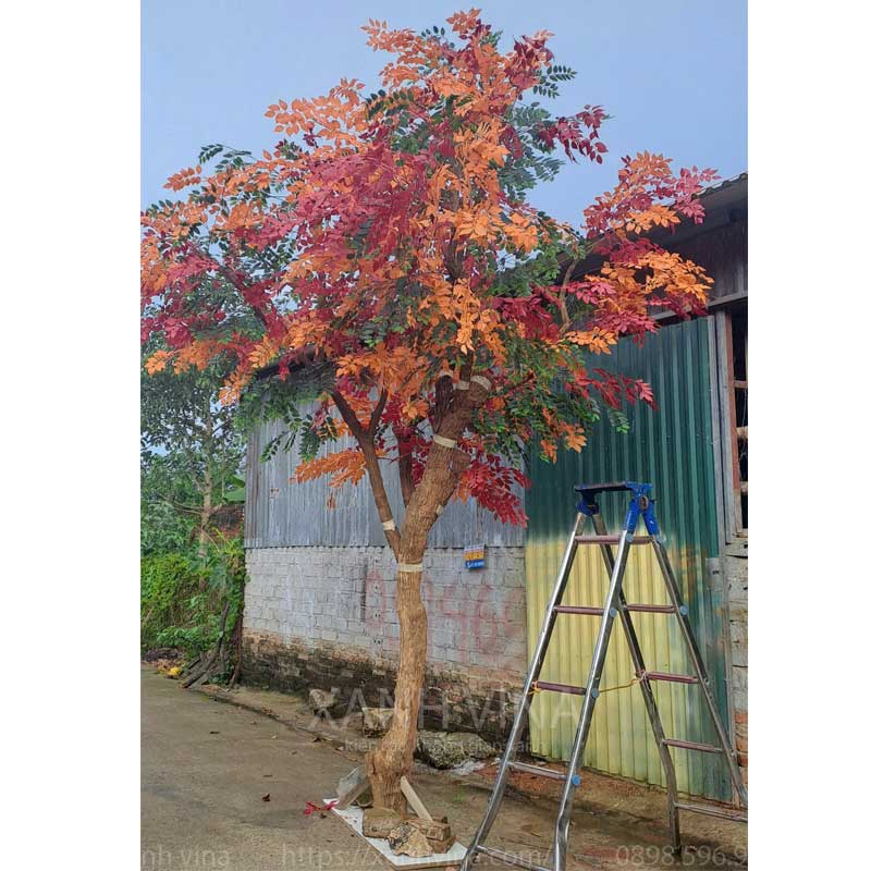 Với chiều cao lên tới 5 mét, cây được cấu tạo vững chắc với thân gỗ thật đường kính 18 cm, đã qua xử lý chống mối mọt, cong vênh và được sơn phủ bảo vệ bề mặt giúp tăng độ bền ngoài trời. Tán lá giả phối 3 gam màu đỏ – cam – xanh được làm từ lụa ép cao cấp, mang lại hiệu ứng thị giác rực rỡ, ấm áp và hài hòa, tượng trưng cho sự thịnh vượng và phát triển bền vững.