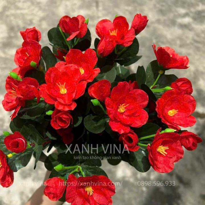Đây là cây hoa đỗ quyên được xanhvina thiết kế theo yêu cầu cho khách hàng, hàng thiết kế dựa theo yêu cầu của khách, khác hoàn toàn so với Cây hoa đỗ quyên giả trang trí truyền thống mà shop vẫn đang bán hàng, hoa đỗ quyên đỏ được thiết kế từ cụm đỗ quyên cao khoảng 40cm, 1 cụm có 10 nhánh và có khoảng 40 -45 bông hoa, hoa được làm từ vải lụa mềm mại, cành lõi thép có thể nắn chỉnh theo ý muốn.