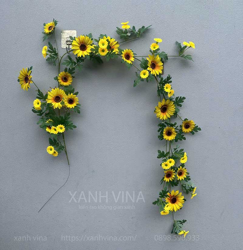 Hoa dây leo hướng dương giả trang trí đẹp luôn là ý tưởng được nhiều người lựa chọn cho ban công, nhà ở, sân vườn. Tuy nhiên với đặc điểm ưa nắng của hoa hướng dương thật, hướng dương không được ứng dụng trong trang trí nội thất, khắc phục điều đó, XanhVina lên ý tưởng trang trí không gian nhà hàng, quán cafe,... bằng hoa dây leo hướng dương giả trang trí đẹp.